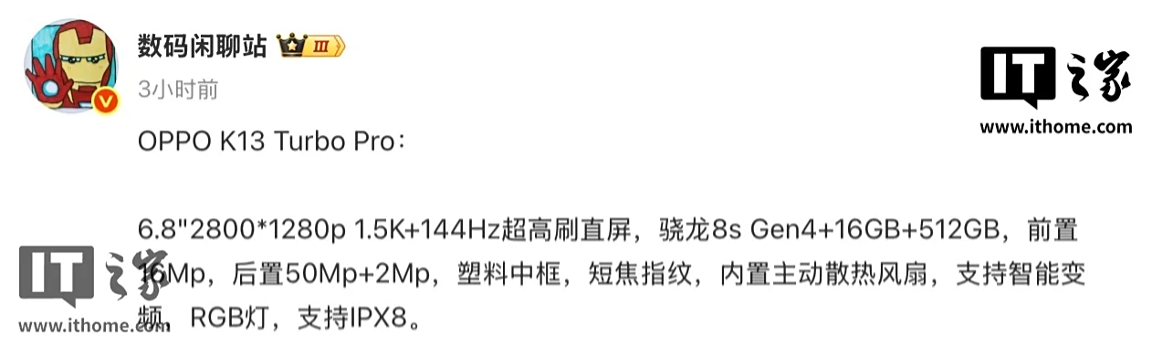 IT之家注意到,博主 @数码闲聊站 曾透露 OPPO K13 Turbo Pro 手机搭载 6.8 英寸 2800×1280 分辨率 144Hz 超高刷直屏,前置 16MP 自拍摄像头,后置 50MP 主摄 + 2MP 辅助摄像头,提供塑料中框和短焦指纹,拥有 IPX8 认证。