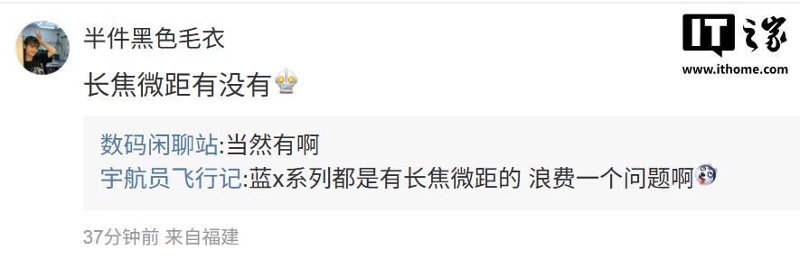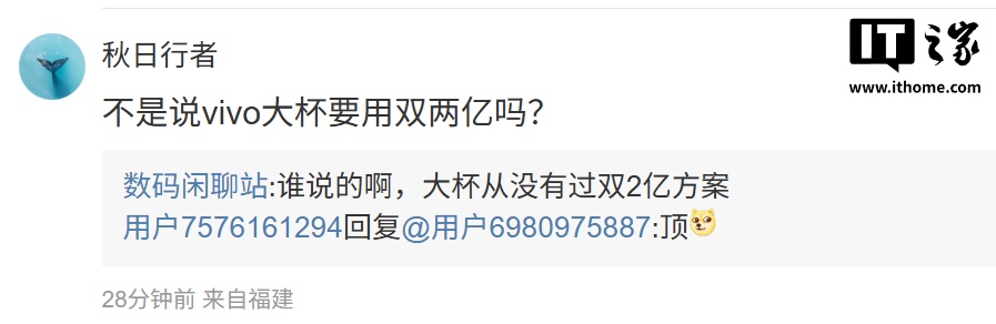 后续,有网友于评论区询问博主:“长焦微距有没有”,博主则表示:“当然有啊”。另外有网友询问:“不是说 vivo 大杯要用双两亿吗”,博主则回复道:“谁说的啊,大杯从没有过双 2 亿方案”。