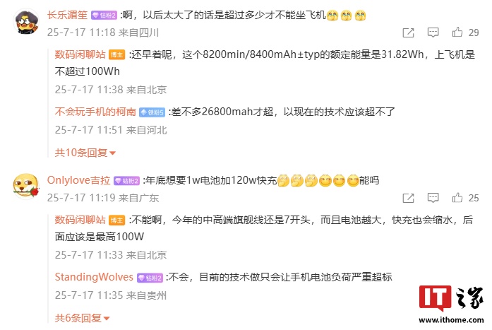博主还在评论区回复了部分网友的问题:针对以后手机电池太大是否不能坐飞机,他称“还早着呢,这个 8200min / 8400mAh±typ 的额定能量是 31.82Wh,上飞机是不超过 100Wh”;针对年底是否会推出 10000mAh 电池 + 120W 快充的新机,他表示“不能啊,今年的中高端旗舰线还是 7 开头,而且电池越大,快充也会缩水,后面应该是最高 100W”。