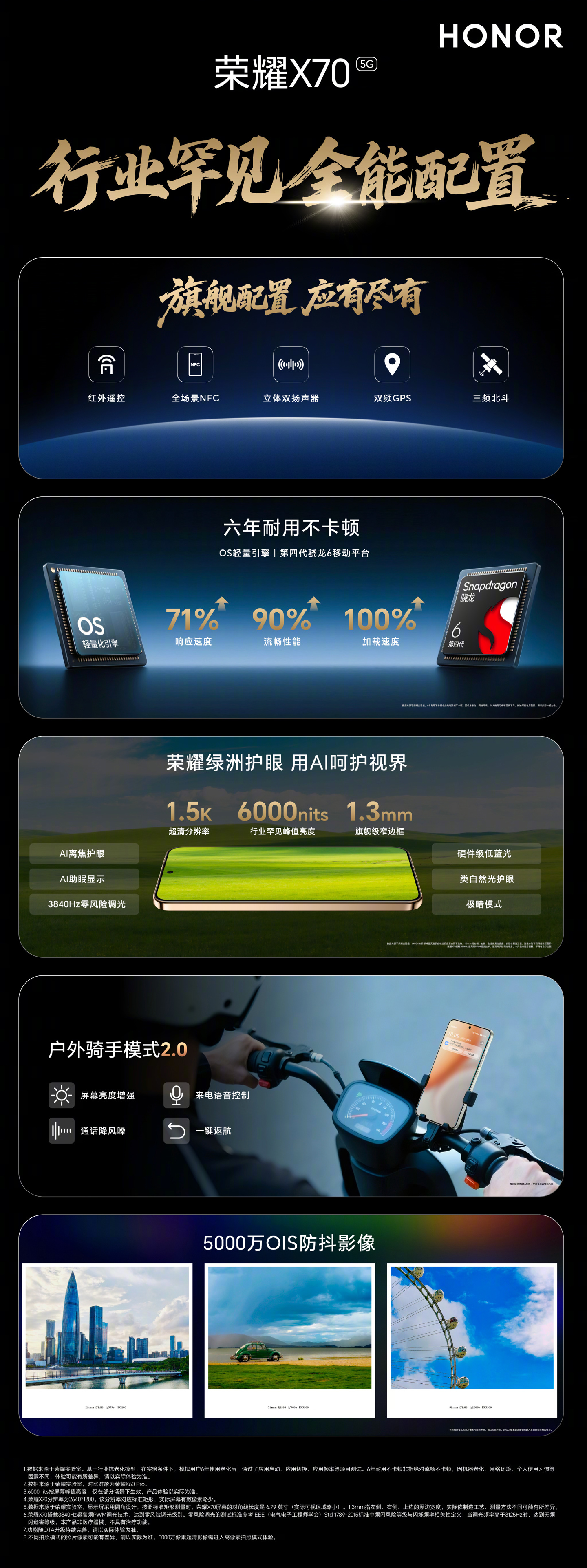 影像系统方面,荣耀 X70 配备了 5000 万像素 OIS 光学防抖主摄,并支持 AI 光影人像优化技术。此外,该手机还配备了 NFC、红外遥控、双扬声器和 Z 轴马达等外围配置。