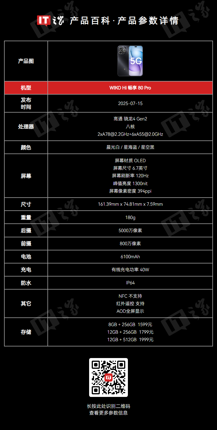 IT之家 7 月 18 日消息,WIKO 今日宣布:Hi 畅享 80 Pro 今日 10:08 正式开售,售价 1599 元起,限时享 365 天只换不修及海量优享权益。IT之家汇总如下: