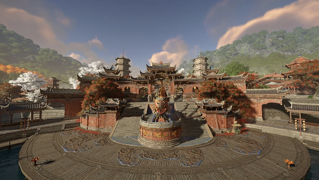 在《逆水寒手游》刺桐港地图中,代表了 13 世纪中国石构建筑技艺的最高水平的地标遗迹建筑泉州开元寺双塔被 1:1 复刻还原,周围簇拥着鲜艳高大的刺桐树,屹立于城市中心,庄重肃穆。