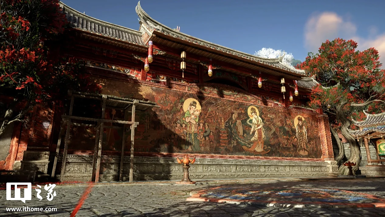 以仁寿塔为例,走进观察就会发现塔身细节满满,从宝塔上各种菩萨、罗汉、武将等雕像,到每层塔檐下方仿木构建筑“斗拱”的石刻版,假门和假窗、檐砖上的兽面图案,再到充满岁月痕迹的砖石和木门,除了不能上手摸和上塔,真就和玩家亲临实地游览一般。即使大家心里都知道这是通过数字扫描、3D 建模和贴图复现的,但在全景光追加持下,宝塔的轮廓和砖石和层次感、浮雕的立体感都更加生动饱满。