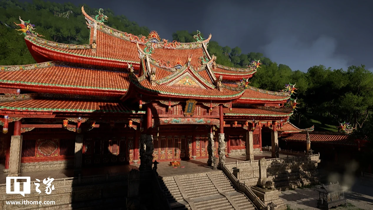 30 米高的妈祖巨像也被“寒子”搬到了游戏中,雕像的还原度足够高,无论是服饰纹理、表情动作还是褶皱和质感,都做得非常细节和逼真。夕阳时分太阳还未落山,阳光照射在妈祖像前方的香炉前,仿佛在暗示着什么。三座宝殿加持,足见其地位的重要性。