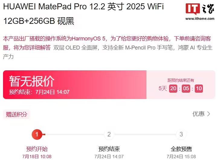 IT之家 7 月 18 日消息,全新华为 MatePad Pro 12.2 英寸平板电脑今日官宣开启预约,新机将预装鸿蒙 HarmonyOS 5 系统。