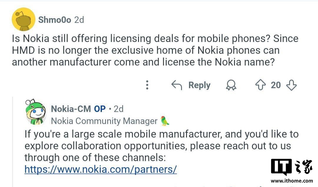IT之家 7 月 19 日消息,Reddit 平台一位名为 Shmo0o 的用户在诺基亚板块发帖,询问诺基亚公司是否考虑开放品牌授权给其他制造商生产手机。