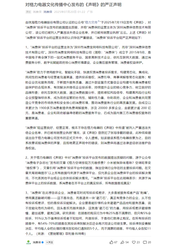 快科技7月20日消息,日前,格力电器发布声明称:“近期,我司发现网络上有自称‘消费保’的投诉平台发布了关于家电企业售后投诉量及解决率对比排行,相关内容已被中华网财经等媒体引用传播。”