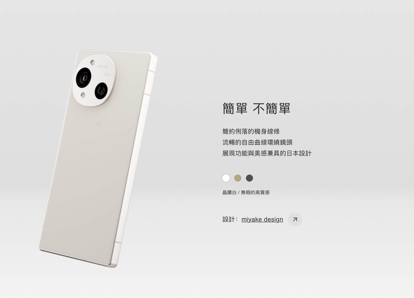 该机尺寸为 156x75x8.9 毫米,重量 197 克,由三宅设计,可选三种配色,手机正面配备一块 6.5 英寸 2340×1080 分辨率 240Hz 可变刷新率打孔 Pro IGZO OLED 面板(峰值亮度 3000 尼特),匹配 50.3MP 自拍摄像头;手机背面采用双摄设计,采用 50.3MP 23mm 主摄(徕卡认证)及 50.3MP 13mm 超广角。