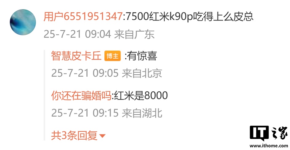 后续有网友于评论区询问:“7500 红米 k90p 吃得上么皮总”,博主回复道:“有惊喜”。