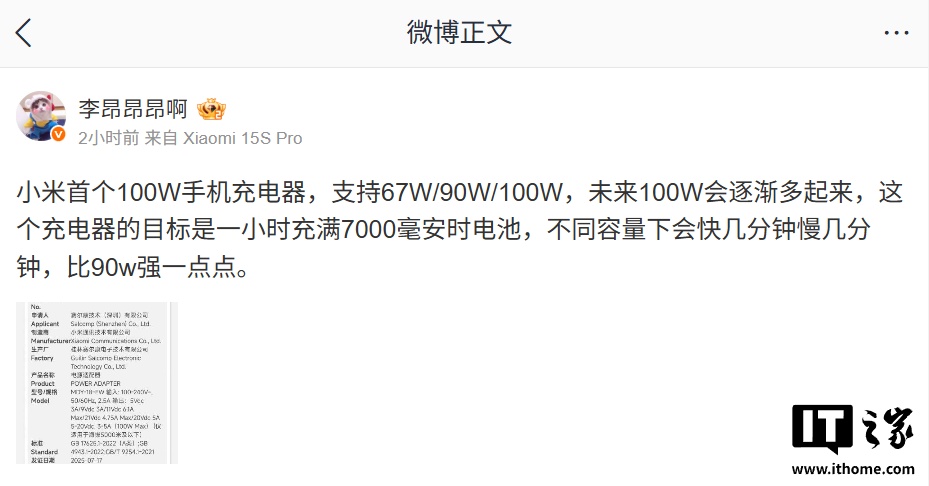 文章来源于互联网:IT之家-小米全新 100W 充电器入网:向下兼容 67W / 90W,小米 16 系列手机有望配备