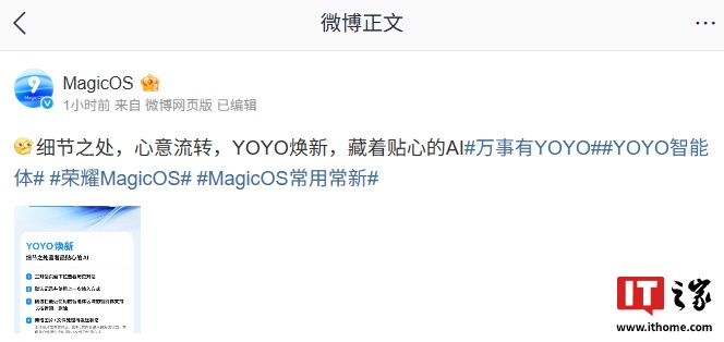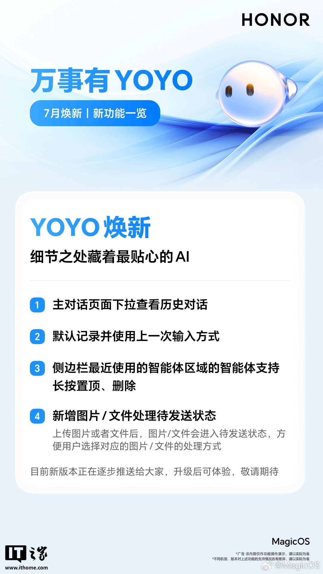 IT之家 7 月 21 日消息,荣耀 AI OS 官方微博 @MagicOS 今日官宣推出 YOYO 助理 7 月新版本升级。