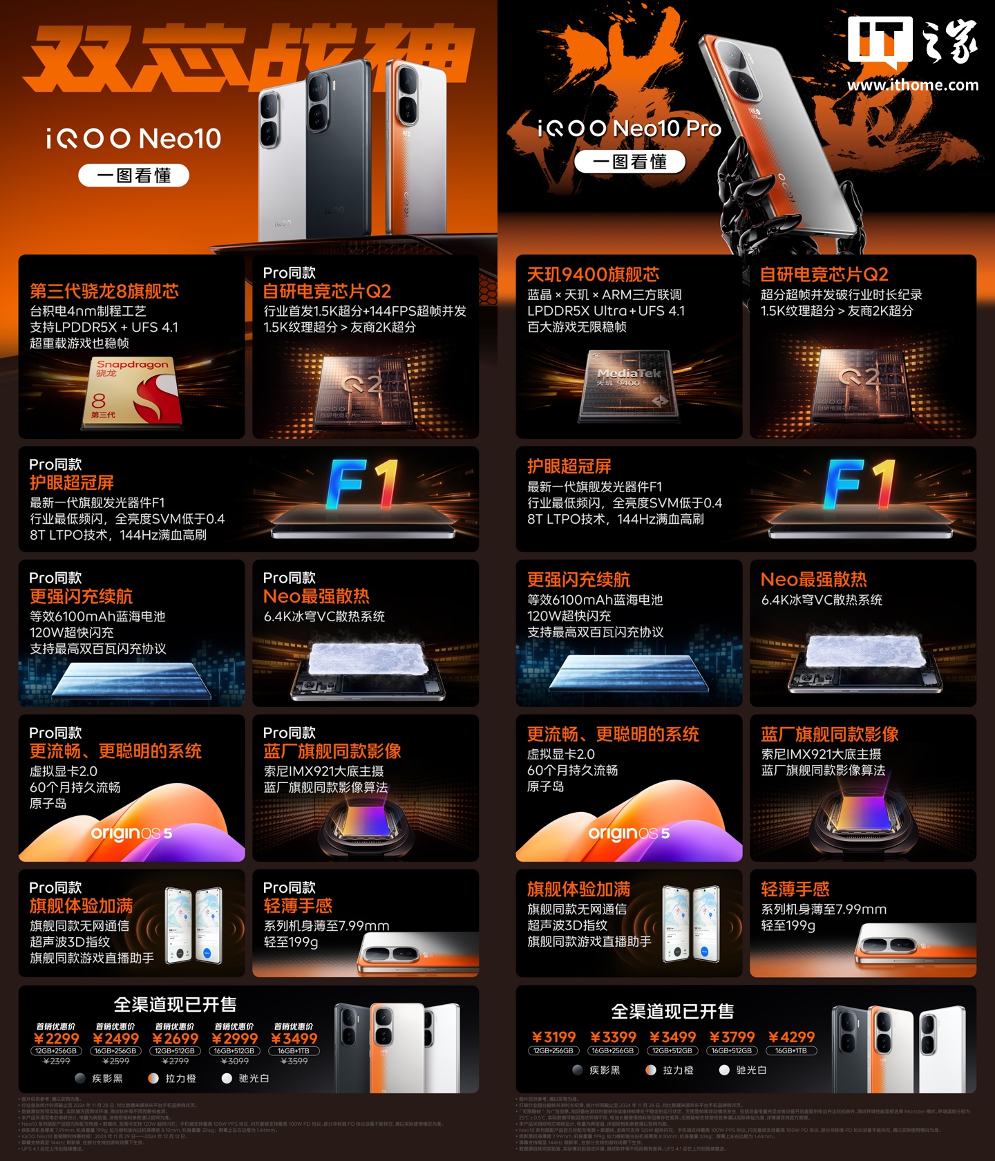 据IT之家过往机型报道来看,iQOO 在去年 11 月推出了 Neo10 / Pro 手机,两款机型分别搭载第三代骁龙 8 和天玑 9400 处理器,性能方案与博主爆料内容一致(即采用高通骁龙上代旗舰和天玑当代旗舰),并全系配备 6.78 英寸 1.5K+144Hz 8T LTPO F1 直屏、6100mAh 电池 + 120W 快充 + 100W PPS 协议、Q2 电竞芯片、6.4K VC 散热、IMX921 大底双摄及 3D 超声波指纹。