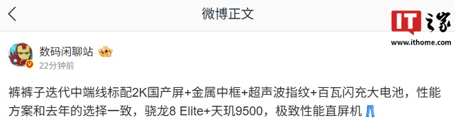 IT之家 7 月 22 日消息,博主 @数码闲聊站 今日发文透露,裤裤子(结合暗示和评论区讨论来看,此处预计指 iQOO)迭代中端线标配 2K 国产屏 + 金属中框 + 超声波指纹 + 百瓦闪充大电池。新机的性能方案和去年的选择一致,分别采用骁龙 8 Elite 和天玑 9500 处理器,定位极致性能直屏机。