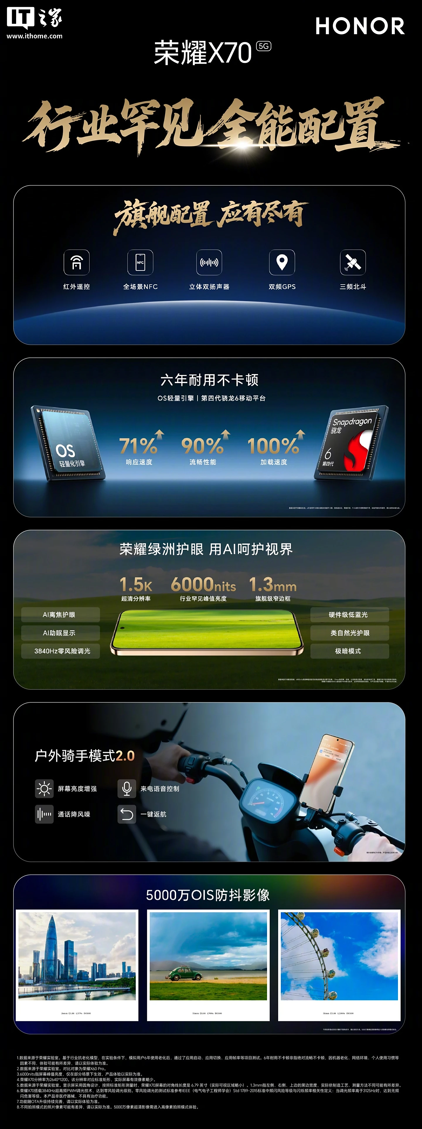 影像系统方面,荣耀 X70 配备了 5000 万像素 OIS 光学防抖主摄,并支持 AI 光影人像优化技术。此外,该手机还配备了 NFC、红外遥控、双扬声器和 Z 轴马达等外围配置。