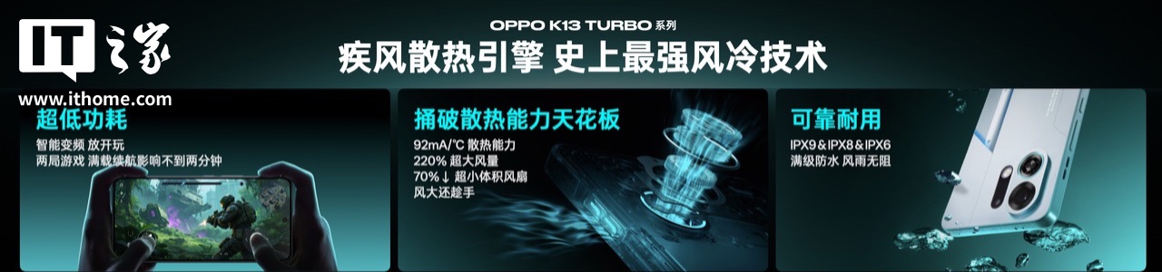 文章来源于互联网:IT之家-OPPO K13 Turbo 系列手机全系标配“疾风散热引擎”主动散热隐藏式风扇,提供智能变频 / 极速暴走双模式