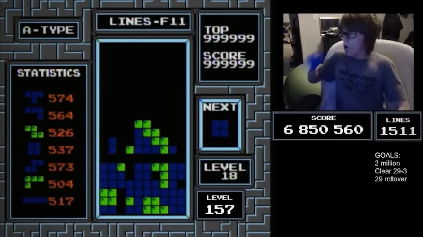而就在 2023 年 12 月 21 日,13 岁的 Blue Scuti 做到了。他成功闯过 157 关,不仅刷新了人类闯关纪录,还触发了“杀屏”,成为首位攻克 NES 版《俄罗斯方块》“杀屏”的人类玩家。