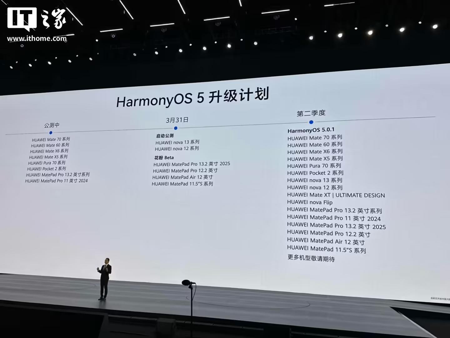 IT之家 7 月 23 日消息,在今年 3 月举行的华为 Pura 先锋盛典及鸿蒙智行新品发布会上,华为鸿蒙 HarmonyOS 5 升级计划公布。其中提到,华为 nova Flip 小折叠手机将在第二季度升级鸿蒙 HarmonyOS 5.0.1。