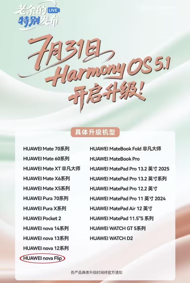 文章来源于互联网:凤凰网-一步到位:华为nova Flip小折叠手机7月31日开启HarmonyOS 5.1版本升级