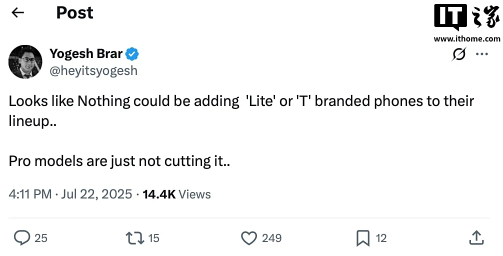 Yogesh Brar 表示,当前 Nothing 正在开发一系列全新“性价比”机型,系列手机后缀名有望命名为(T)或者(Lite)。事实上当前 Nothing 已经推出了 Nothing Phone(3a)平价机型,但该公司显然有意进一步丰富产品线。