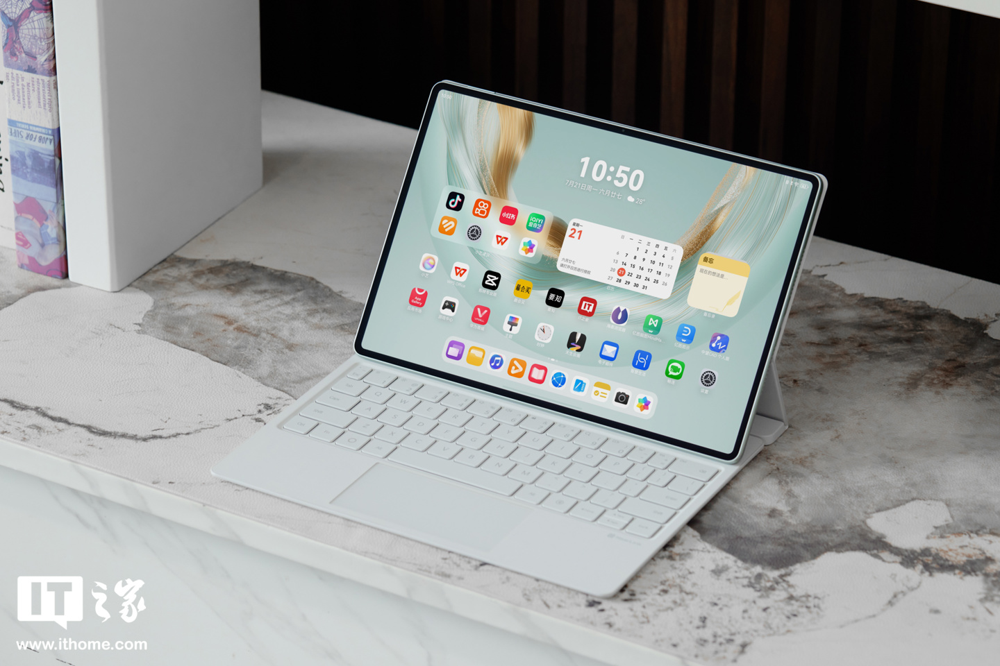 同时,华为 MatePad Pro 12.2 英寸配套的华为星跃键盘也同样轻薄,两者“合体”之后,实现类 PC 开合体验,依旧有着不错的便携性和优雅的外观。