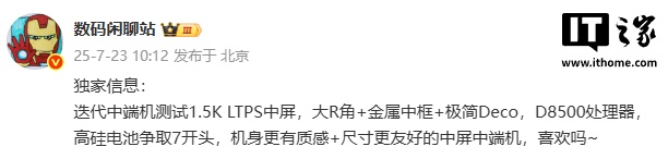 据爆料,该机测试 1.5K LTPS 中屏,大 R 角 + 金属中框 + 极简 Deco,天玑 8500 处理器,高硅电池争取 7 开头,机身更有质感 + 尺寸更友好的中屏中端机。