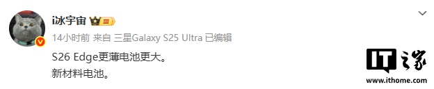 文章来源于互联网:IT之家-消息称三星 Galaxy S26 Edge 机身更薄,电池更大