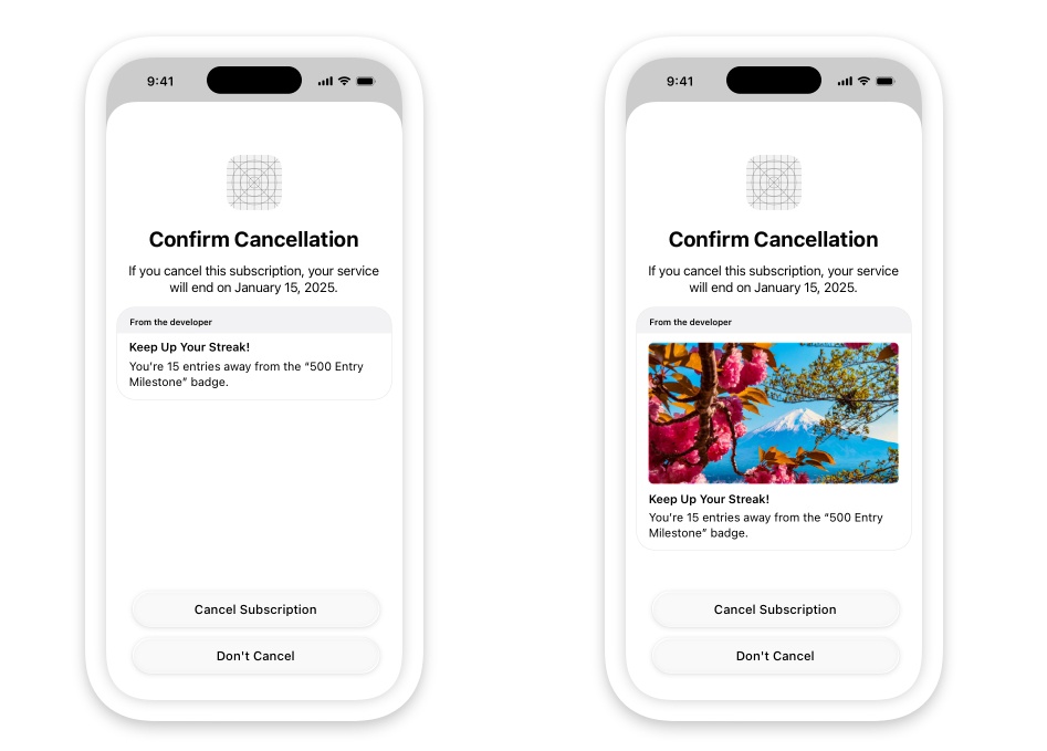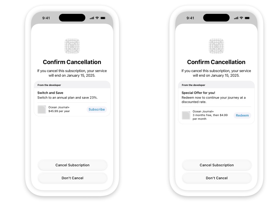尽管订阅屏幕的用户界面主要由苹果管理,但开发者仍然可以在一定范围内展示这些新的保留优惠,允许使用简单的图像、文本和购买按钮布局。