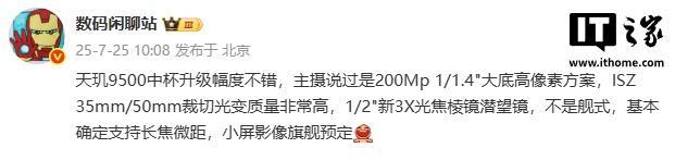 IT之家 7 月 25 日消息,博主 @数码闲聊站 今日曝光某厂天玑 9500 中杯新机的部分规格,预计为 vivo X300 标准版。