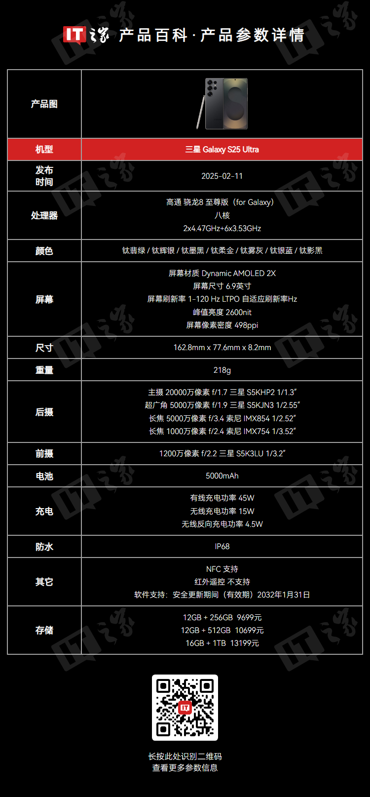 IT之家附三星 Galaxy S25 Ultra 手机参数如下: