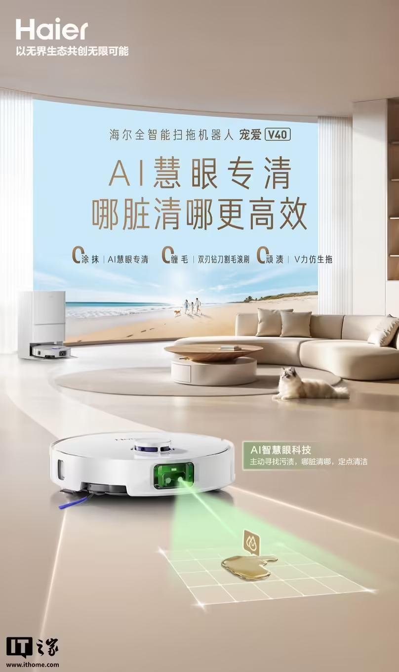 IT之家 7 月 25 日消息,海尔现已在京东上架一款型号为“宠爱 V40”的扫地机,该扫地机主打 20000Pa 吸力,定价为 3299 元,部分地区国补后到手价低至 2792.93 元。