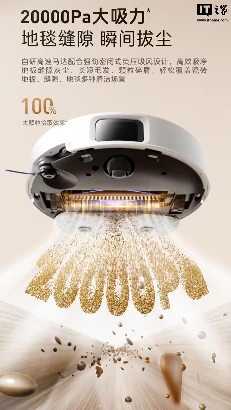 该扫地机提供 20000Pa 吸力,号称可实现 100% 大颗粒物拾取率,配备毛发 0 缠系统,可在清洁过程中实时切割毛发,同时配有 V 力仿生拖布、交叉除污技术及 40-75℃动态热水循环系统以清除厨房油渍、脚印等顽固污垢。
