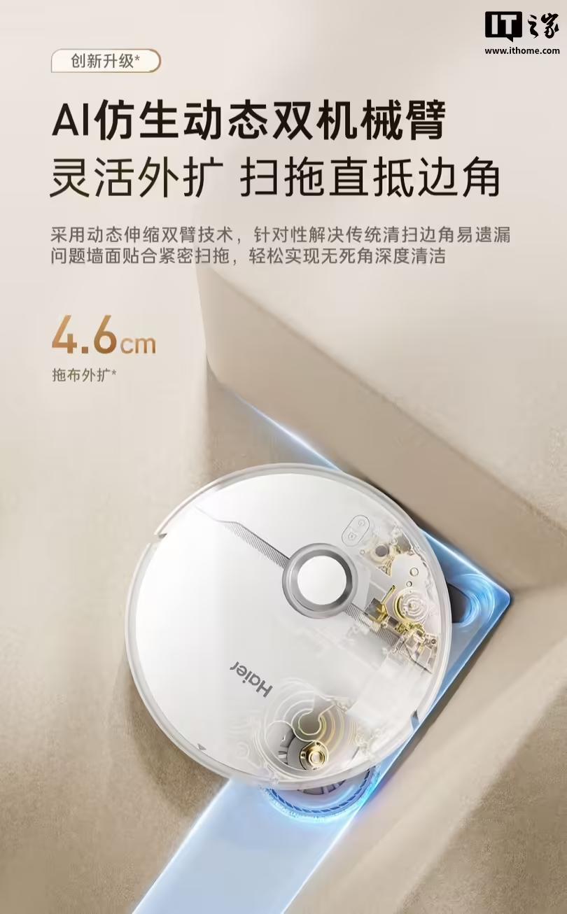 据介绍,这款扫地机搭载“AI 智慧眼”传感器,可实时扫描地面环境,主动寻找污渍擦除。同时可自动区分地毯、地板等不同地面材质;扫地机配备仿生动态双机械臂设计,配合 360° 全向移动能力,实现全屋无死角覆盖。