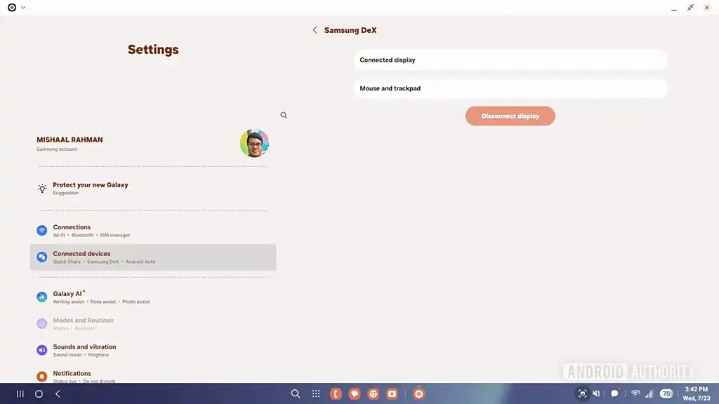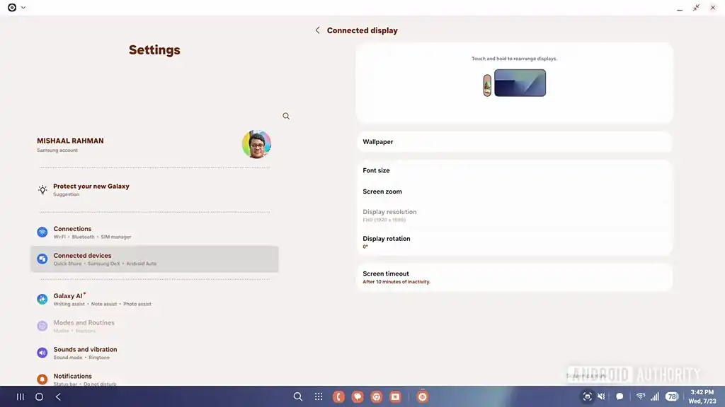 其中最值得关注的改进,就是连接到外部显示器后,设置中移除了专用的 DeX 标签(被“已连接显示器”菜单取代),同时“退出 DeX”按钮也从应用抽屉中消失。应用抽屉现在可以垂直滚动,任务栏也会显示手机上停靠的应用。