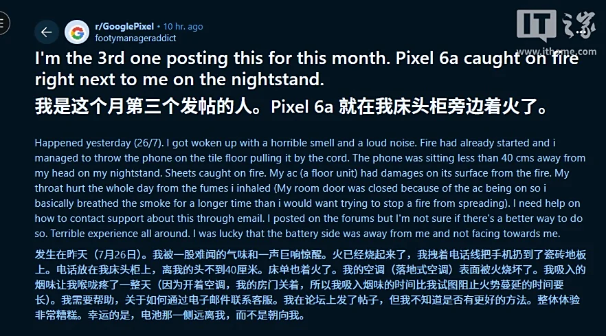 文章来源于互联网:IT之家-Pixel 6a 手机起火引燃床单,致用户吸入浓烟