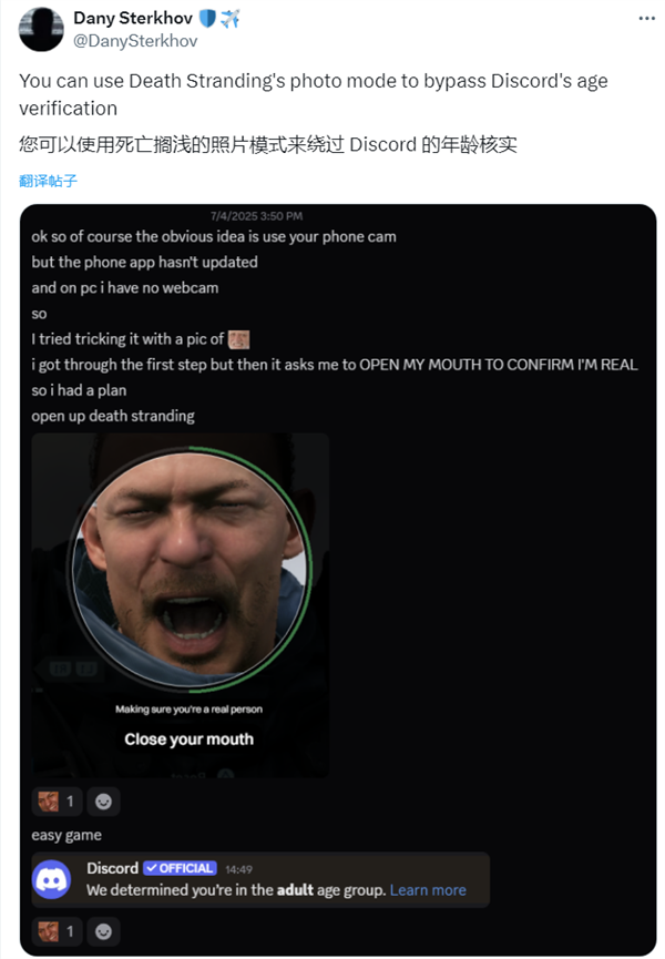英国玩家发现,《死亡搁浅 2》中主角“山姆·波特·布里吉斯”的面部模型逼真度极高,足以误导验证系统。