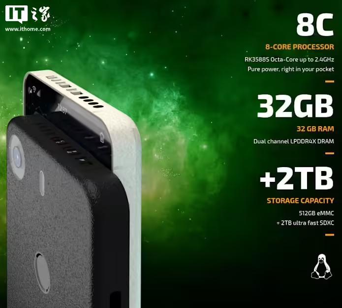 该机搭载 Rockchip RK3588S 处理器(4 个 Cortex A76 加 4 个 Cortex A55 核心,最高 2.4Ghz 频率),辅以 32GB LPDDR4x RAM,匹配可拆卸 512GB eMMC 存储。手机支持 5G、Wi-Fi 5 和蓝牙 5.0,并设有双 USB-C 接口。