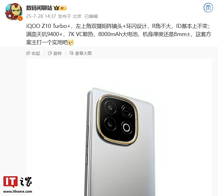 IT之家注意到,博主 @数码闲聊站 今日发文透露,iQOO Z10 Turbo+ 手机左上角双摄采用矩阵镜头 + 环闪设计,R 角不大,ID 基本上不变;搭载满血天玑 9400+ 处理器,拥有 7K VC 散热 + 8000mAh 大电池,机身厚度 8mm±,主打实用。