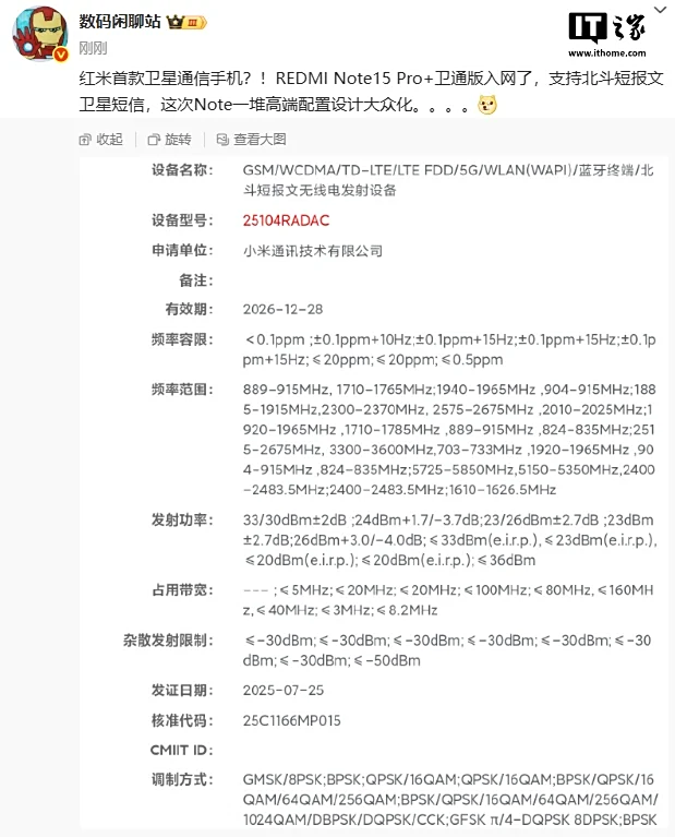 IT之家 7 月 28 日消息,一款型号为“25104RADAC”小米新机于 7 月 25 日通过无线电核准,支持北斗短报文卫星短信。据博主 @数码闲聊站 确认,该机为 REDMI Note15 Pro + 卫通版,系 REDMI 首款卫星通信手机。