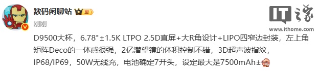 据爆料,该机配备 6.78 英寸 ±1.5K LTPO 2.5D 直屏 + 大 R 角设计 + LIPO 四窄边封装,搭载左上角矩阵 Deco、2 亿潜望镜、3D 超声波指纹、IP68 / IP69 防尘防水、50W 无线充,电池确定 7 开头,设定最大是 7500mAh±。