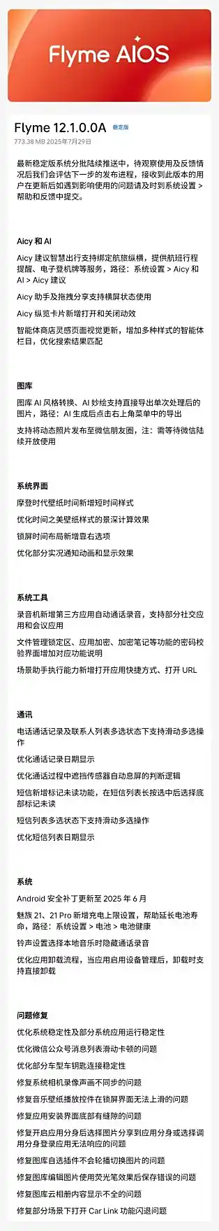 IT之家 7 月 29 日消息,魅族 21 系列手机现已开始小范围推送 FlymeOS 12.1 稳定版灰度,版本号为 12.1.0.0A,更新包大小为 773MB。