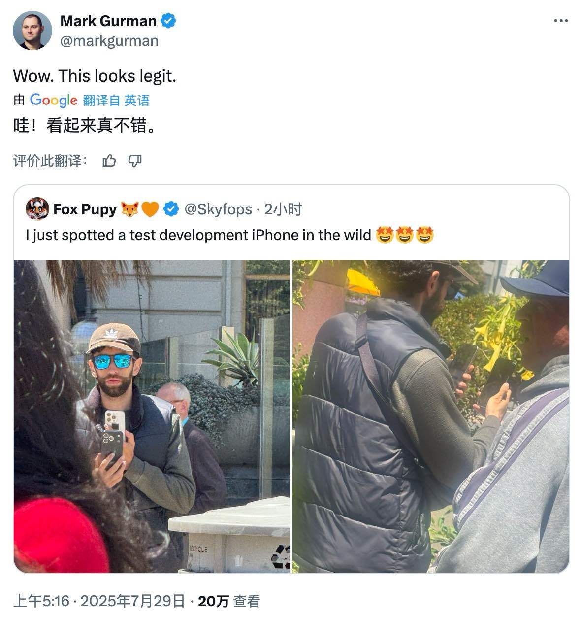 彭博社知名苹果记者马克·古尔曼(Mark Gurman)转发了@Skyfops的帖子,似乎认为这可能是真机。“看起来像那么回事。”古尔曼表示。当然,古尔曼也有可能是在说反话。