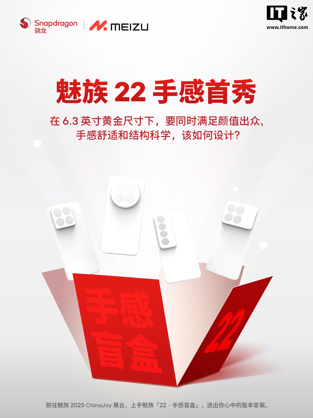 据IT之家此前报道,魅族科技官方微博昨日宣布,魅族「22・手感盲盒」已陈列,用户 8 月 1 日 – 4 日可在上海・新国际博览中心骁龙主题馆 N5-10 展台体验。预热海报显示,魅族 22 手机将采用 6.3 英寸黄金尺寸设计,要同时满足颜值出众、手感舒适和结构科学三大要求。