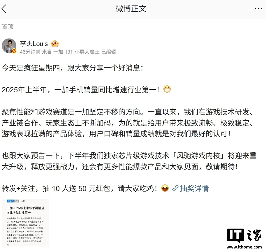 文章来源于互联网:IT之家-一加手机 2025 上半年销量同比增速行业第一,“风驰游戏内核”下半年重大升级