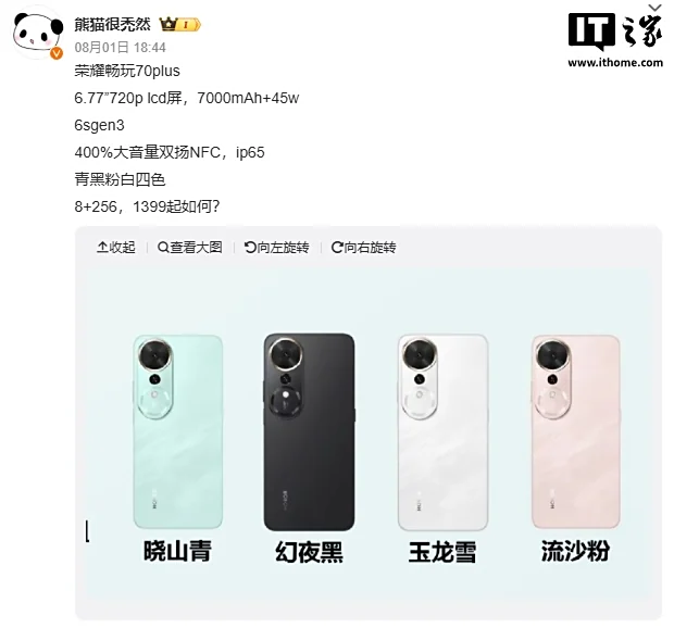 IT之家 8 月 2 日消息,博主 @熊猫很禿然 昨日曝光荣耀畅玩 70 Plus 手机部分参数,搭载 6.77 英寸 LCD 屏、7000mAh 电池。