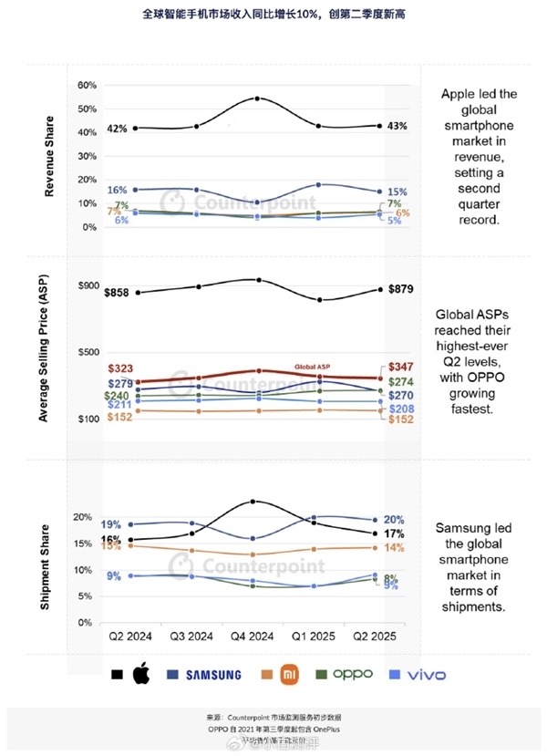 具体来说,iPhone平均销售价格最高,为879美元(约6335元);而OPPO的平均销售价格增长最快,第2季度平均价格为274美元(约1975元),其已经追赶上了三星,这确实是一个不错的现象。