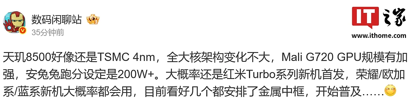 在搭载天玑 8500 的下游终端设备方面,这位消息博主表示“大概率还是(小米红米 Turbo 系列新机首发”,荣耀 / OPPO-一加 / vivo 大概率都会推出基于该平台的新机,目前其了解到的几个相关设计方案均采用了金属中框。