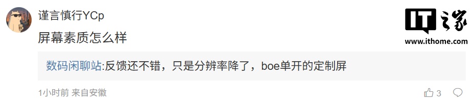 而另一位网友则询问道:“屏幕素质怎么样”?博主表示:“反馈还不错,只是分辨率降了,BOE 单开的定制屏”。
