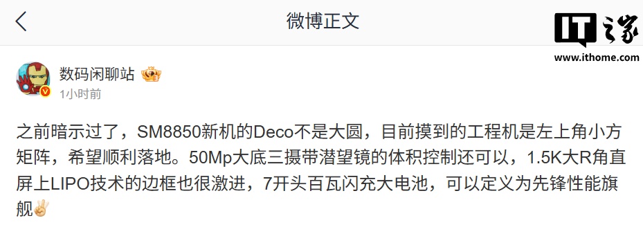 IT之家 8 月 5 日消息,博主 @数码闲聊站 今天在微博爆料,某厂 SM8850 芯片新机的相机 Deco 不是大圆,预计为一加 15 系列。