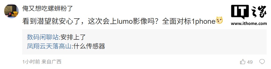 ”;另一位用户询问道:“看到潜望就安心了,这次会上 LUMO 影像吗?全面对标 1Phone