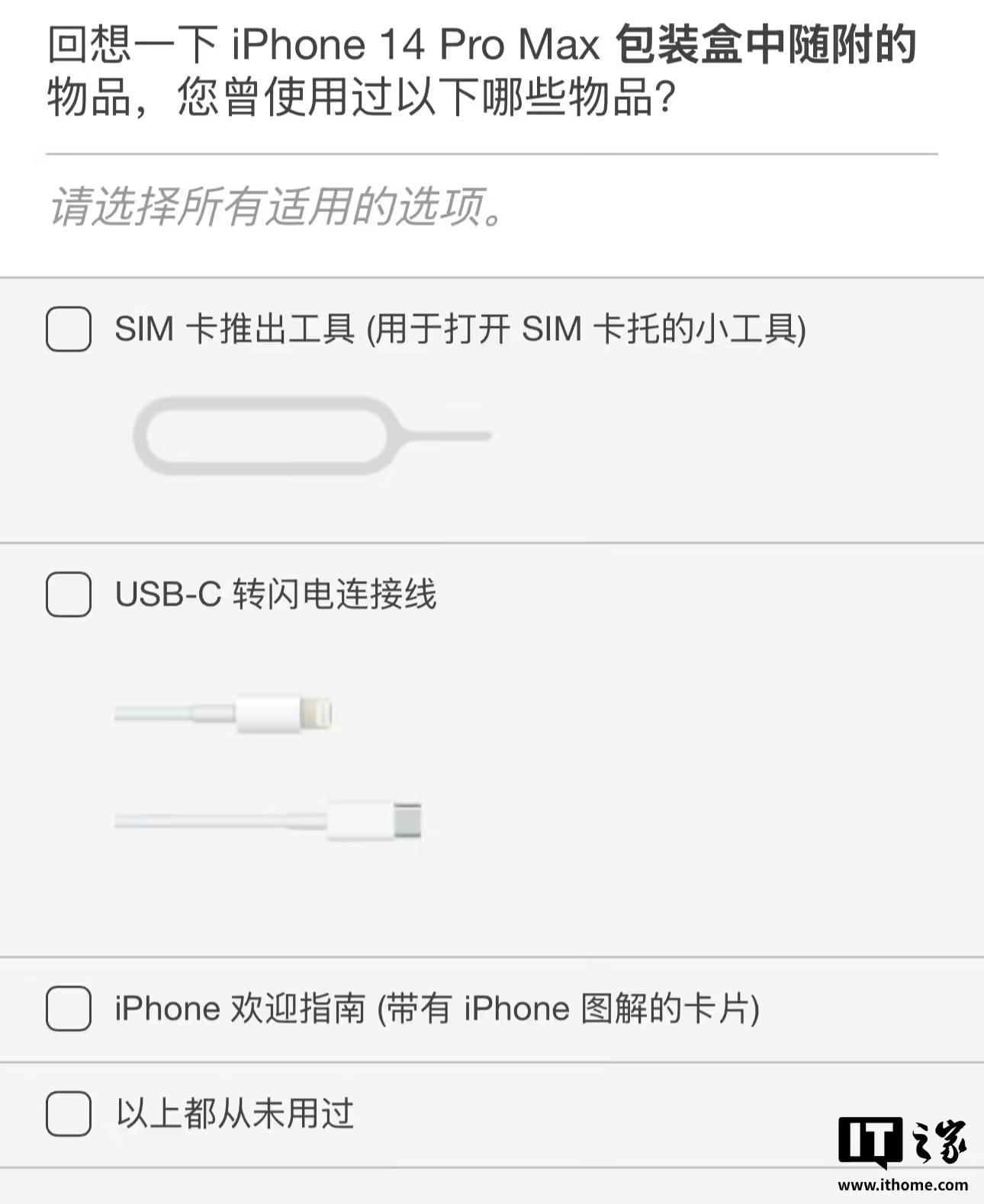 此外,苹果还在问卷里询问了用户对现有 iPhone 包装盒内物品的使用频次,如“欢迎指南”纸片、取卡针、数据线。